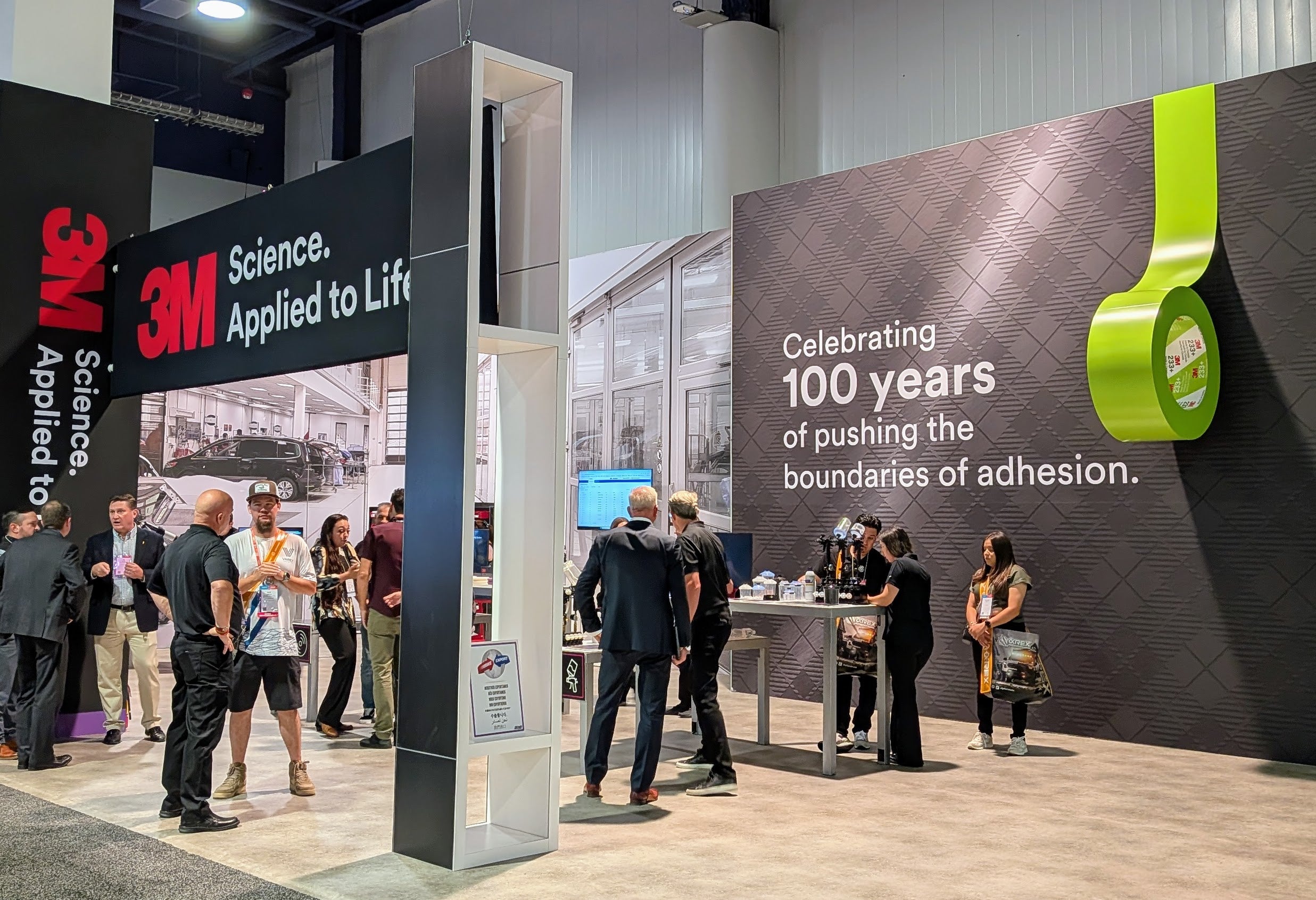 3M blended history and innovation with demos grouped by repair stages set against a backdrop of an actual auto shop. An oversized neon roll of tape added a modern, vibrant touch, illustrating how the brand never stops innovating.