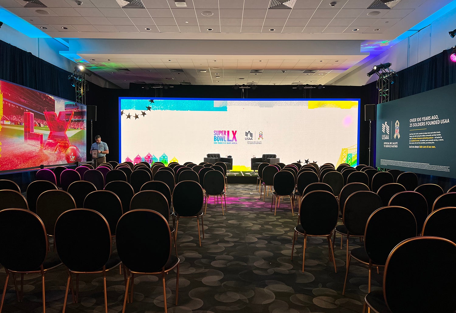 In December, USAA launched its new creative platform called “Taking Care of our Own,” which was incorporated into the lounge’s branding through large display panels and a video board that, during sessions, ran videos and messaging highlighting USAA’s year-round Salute to Service efforts. Gorsuch says the team takes into account the balance of Super Bowl and NFL branding with that of USAA.