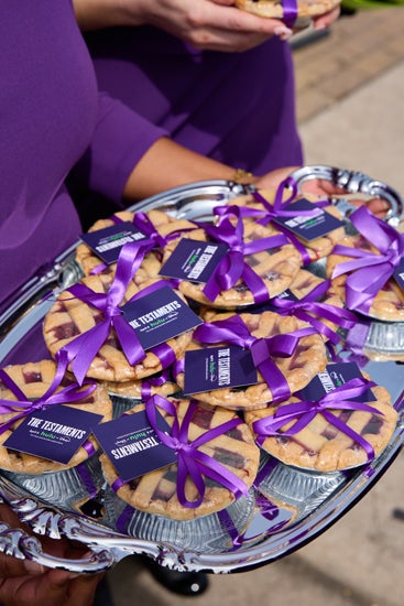 The anchor of the experience was Aunt Lydia’s purple prep-school bus that wheeled through the city and made three stops on high-traffic streets. At each location, an assembly of Plums disembarked from the vehicle in a single-file line while holding the mini pies out in front of them.