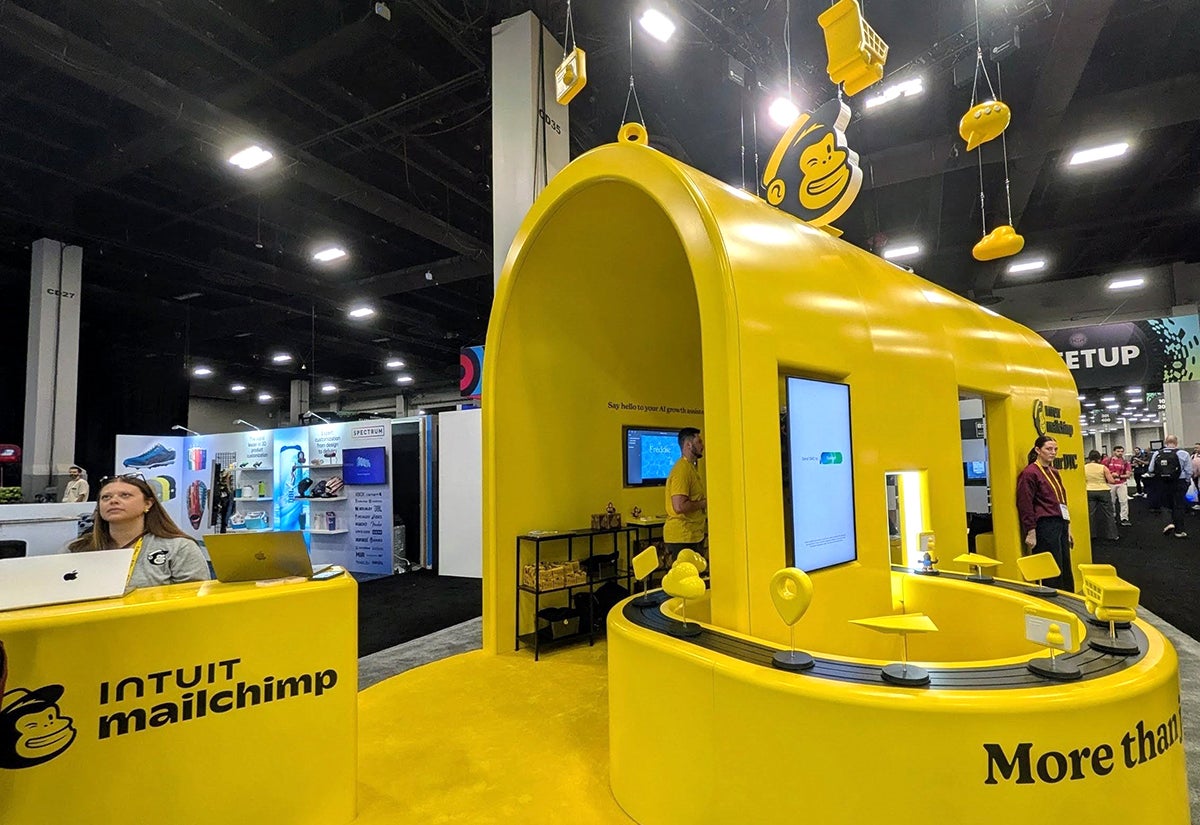 We notice it time and time again: Whenever booth elements move, traffic follows. Intuit Mailchimp brought a bright-yellow booth that was easy to spot across the floor not just because of its color, but also thanks to the dynamic elements of the company’s ecosystem set in motion overhead and on the conveyor belt on the ground.