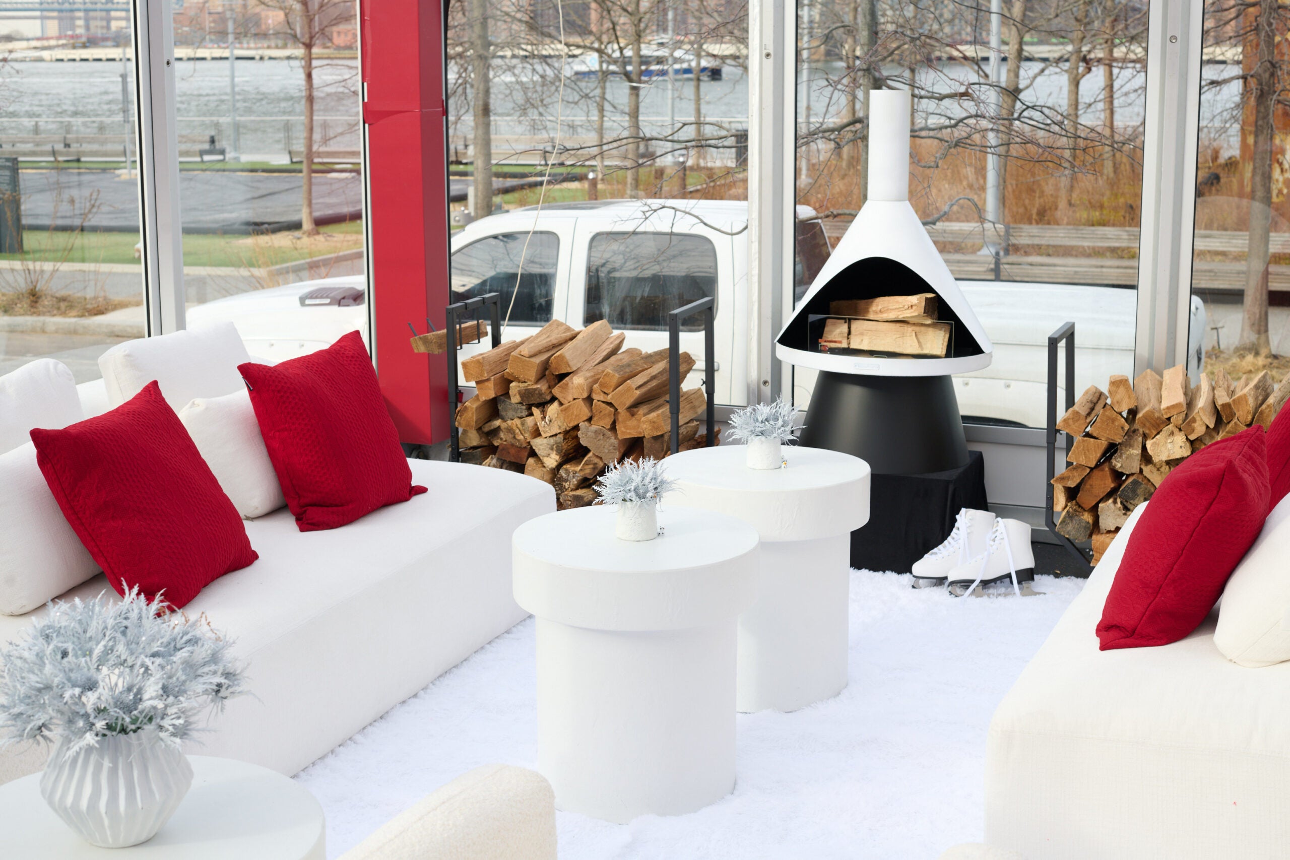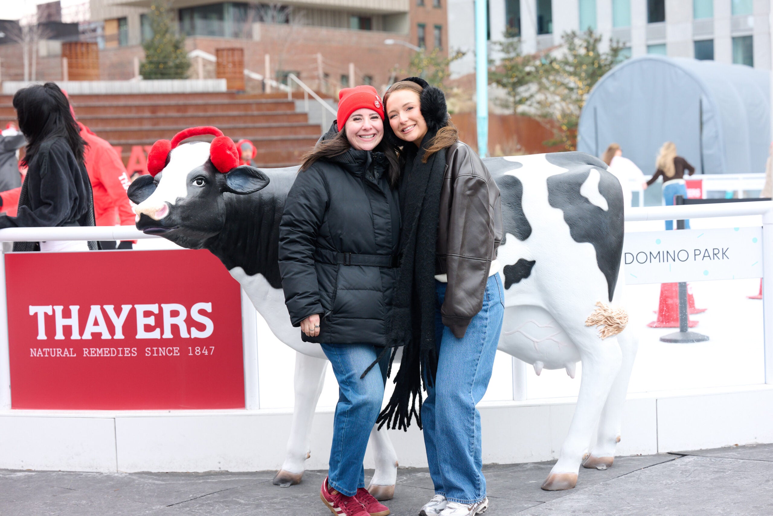 Off the ice, Thayers converted the park’s interior space into the Thayers Milky Wonderland Lodge, decked out in white furs, branded scarves and earmuffs, frosty florals, a fireplace, white couches and a drippy table. Attendees warmed up at a hot chocolate bar and took pictures at a photo booth made to look like a giant ice block. Cows became a symbol for the Milky line, so the brand put out cow-shaped cookies and a life-size plastic cow wearing the Thayers cold-weather accessories.