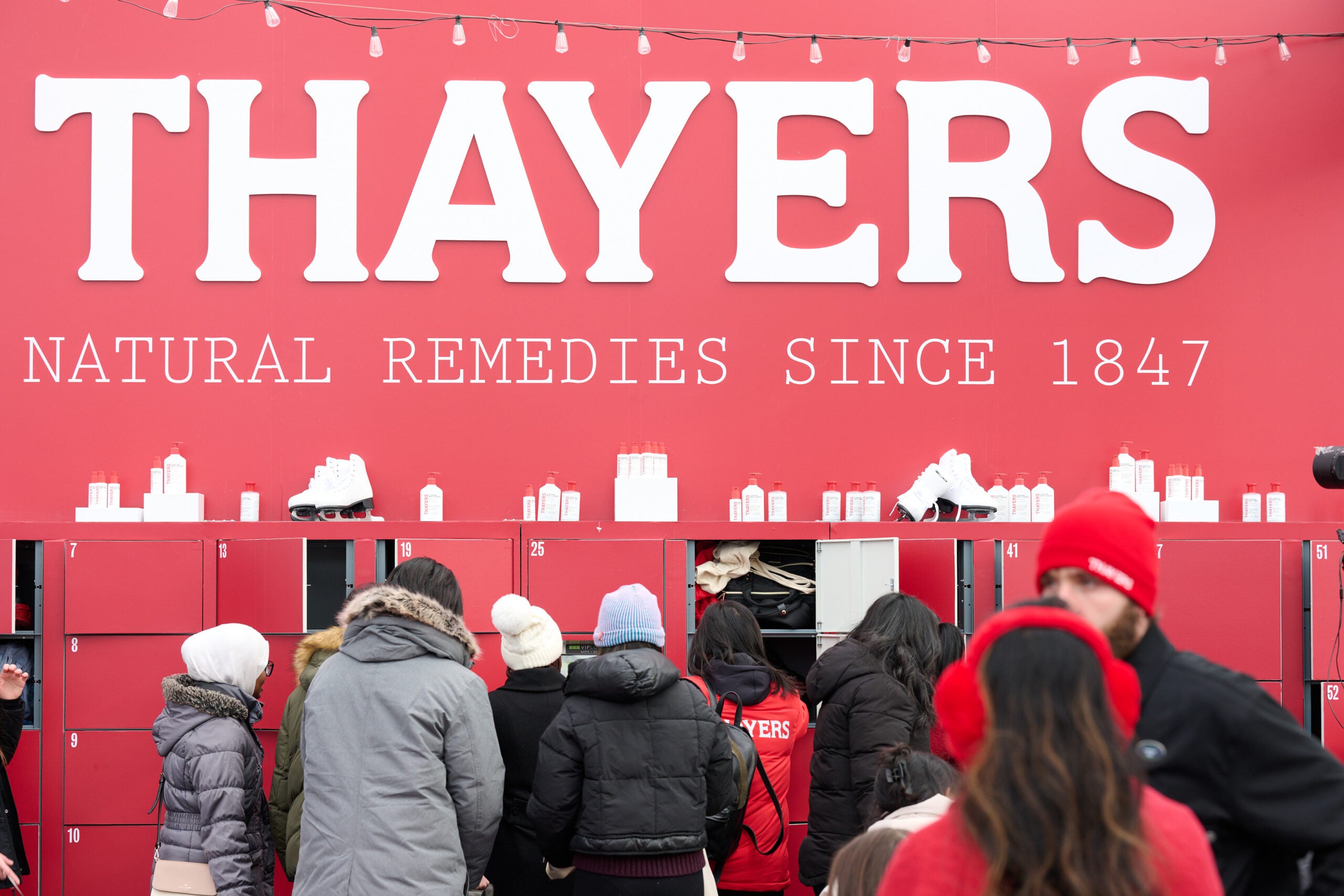 Thayers opened the Milky Wonderland pop-up to consumers on Jan. 23, and Minto-Sparks says almost every attendee strapped on skates to hit the ice, where bundled-up coaches were on hand to assist newbies and spin them around. Pro skaters in red Thayers outfits showed off tricks, jumps and lifts. Skating aids in the shape of oversized Thayers Hydrating Milky Toner bottles were also available for participants to lean on as they skated around the rink.